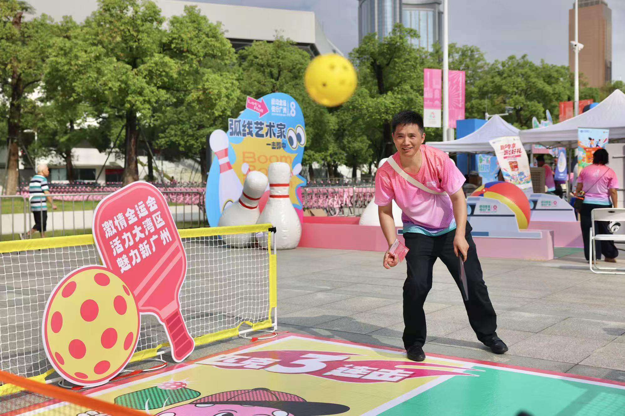 在全运嘉年华活动现场,蹦床、篮球、乒乓球等全运项目的趣味玩法摊位前排起长队,运动热情从赛场延伸到市民身边。